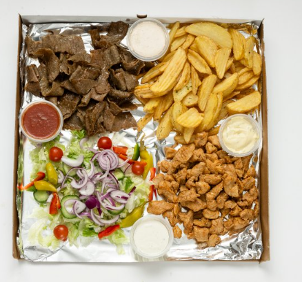 4 valfria tallrikar, 4 valfria såser, 4 pommes ingår och valfri 2 l läsk ingår.
